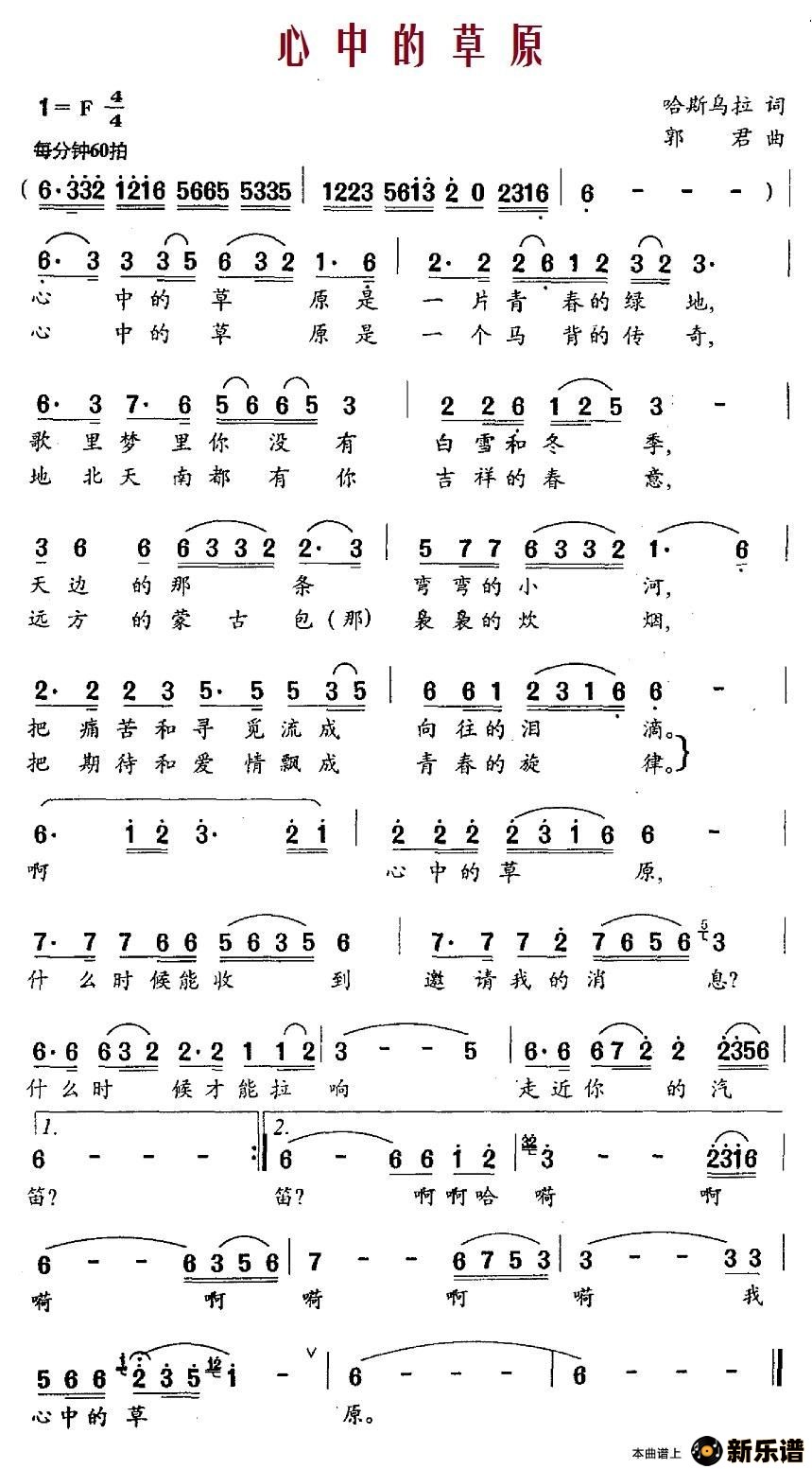 演唱的心中的草原歌词,心中的草原最新曲谱.
