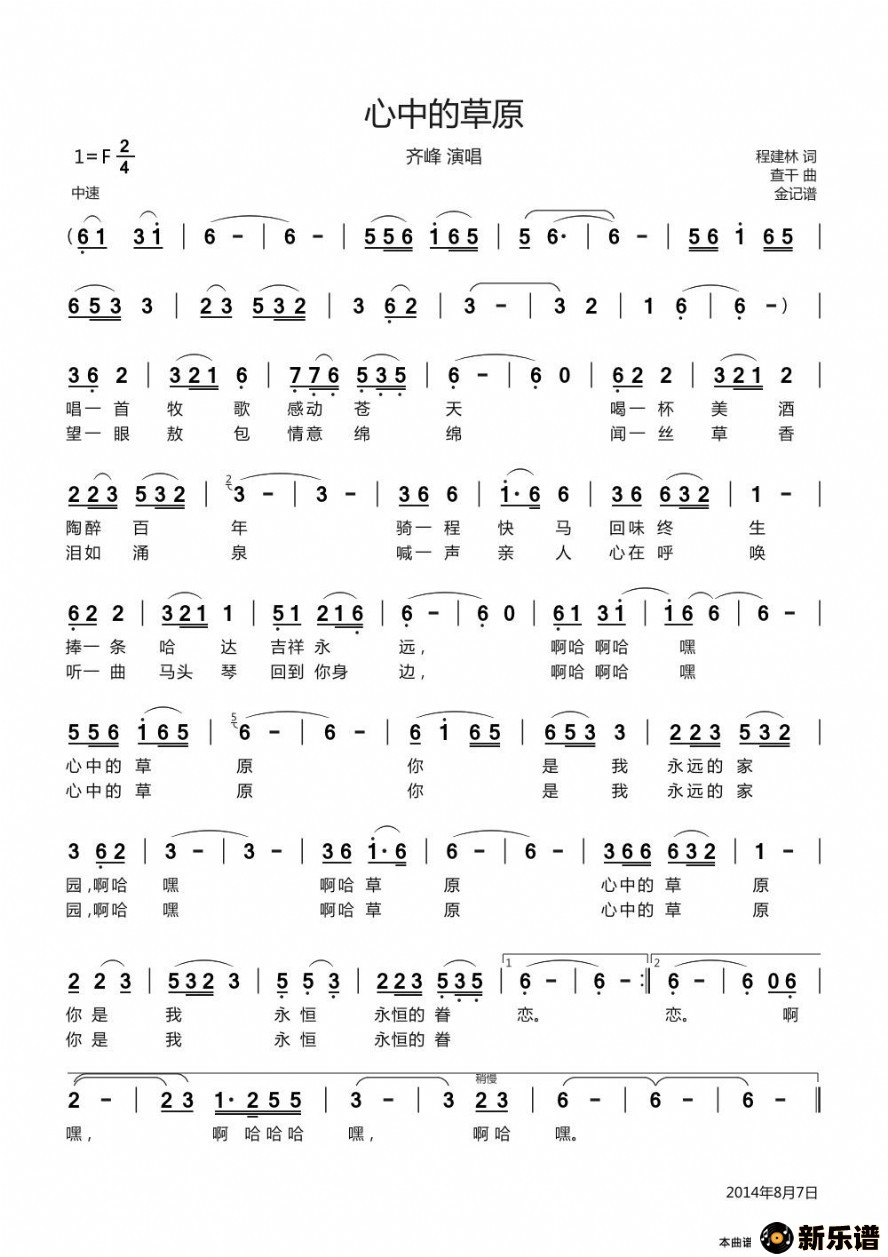 齐峰演唱的心中的草原歌词,心中的草原最新曲谱.