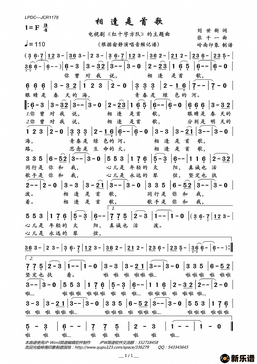 《相逢是首歌(电视剧《红十字方队》的主题曲)》最新曲谱 俞静-岭南印象制谱
