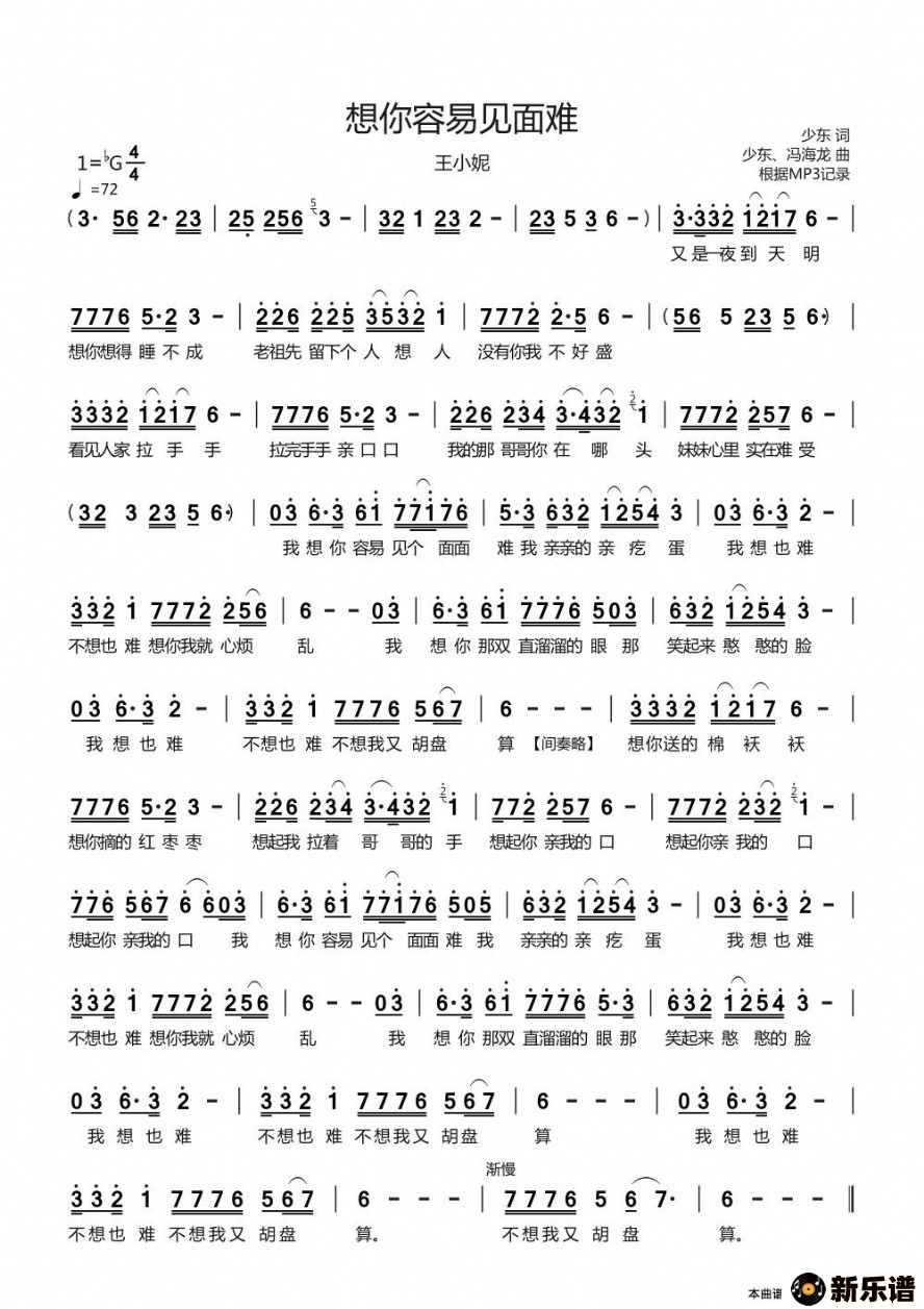 王小妮演唱的想你容易见面难歌词,想你容易见面难最新曲谱.