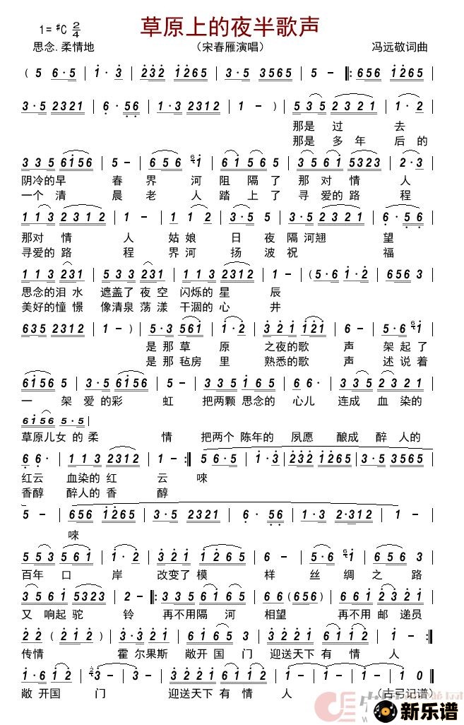 宋春雁演唱的草原上的夜半歌声 歌词,草原上的夜半歌声 最新曲谱.