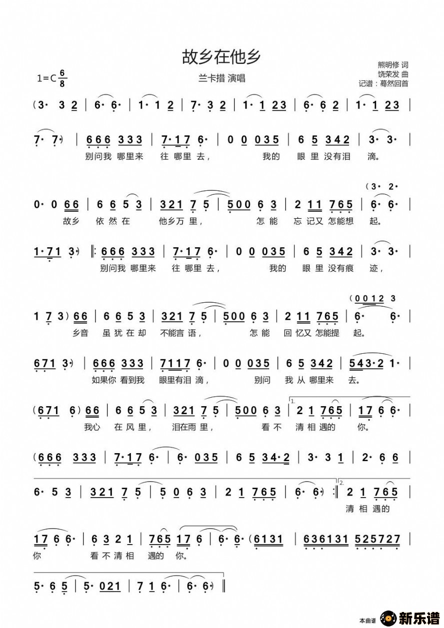 兰卡措演唱的故乡在他乡歌词,故乡在他乡最新曲谱.