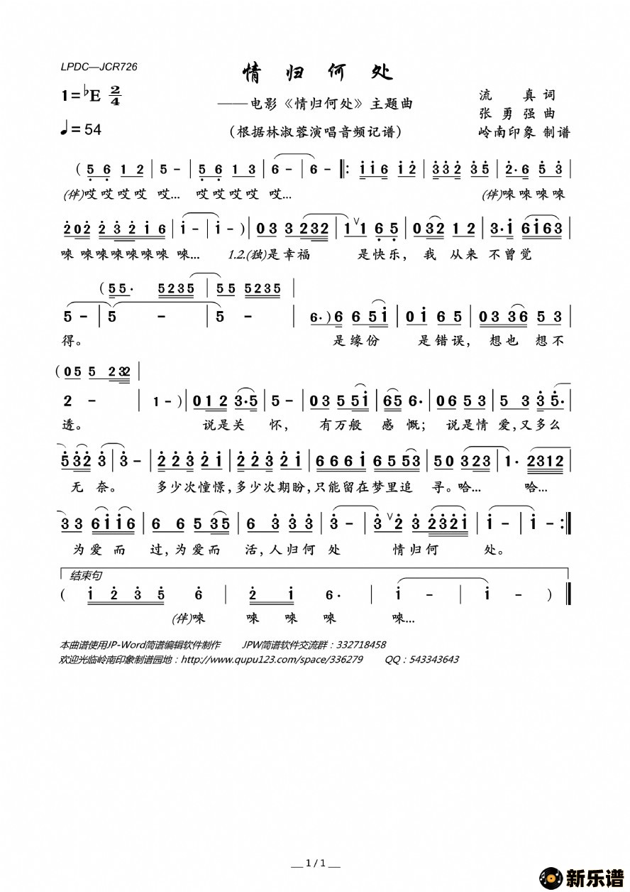 《情归何处(电影《情归何处》主题曲)》最新曲谱 林淑蓉-岭南印象制谱