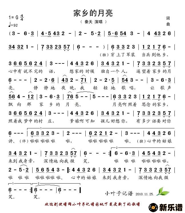 秦天演唱的家乡的月亮歌词,家乡的月亮最新曲谱.