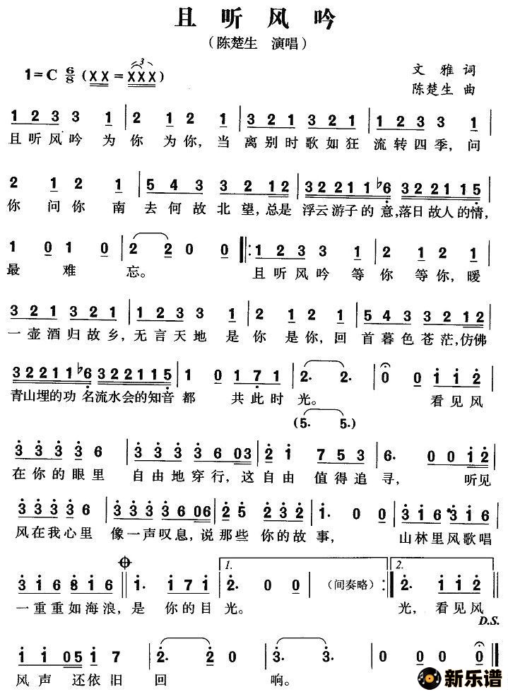 陈楚生演唱的且听风吟歌词,且听风吟最新曲谱.
