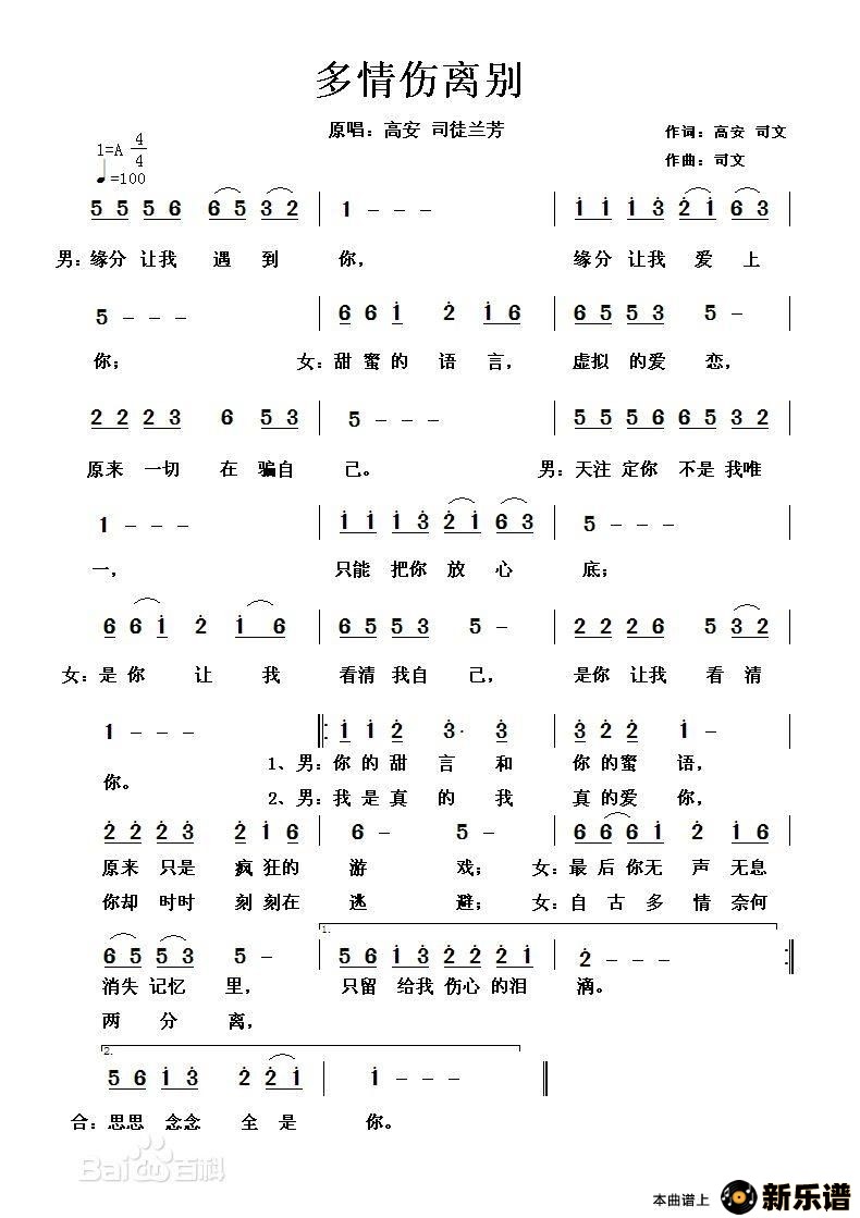 《多情伤离别》最新曲谱 高安/司徒兰芳