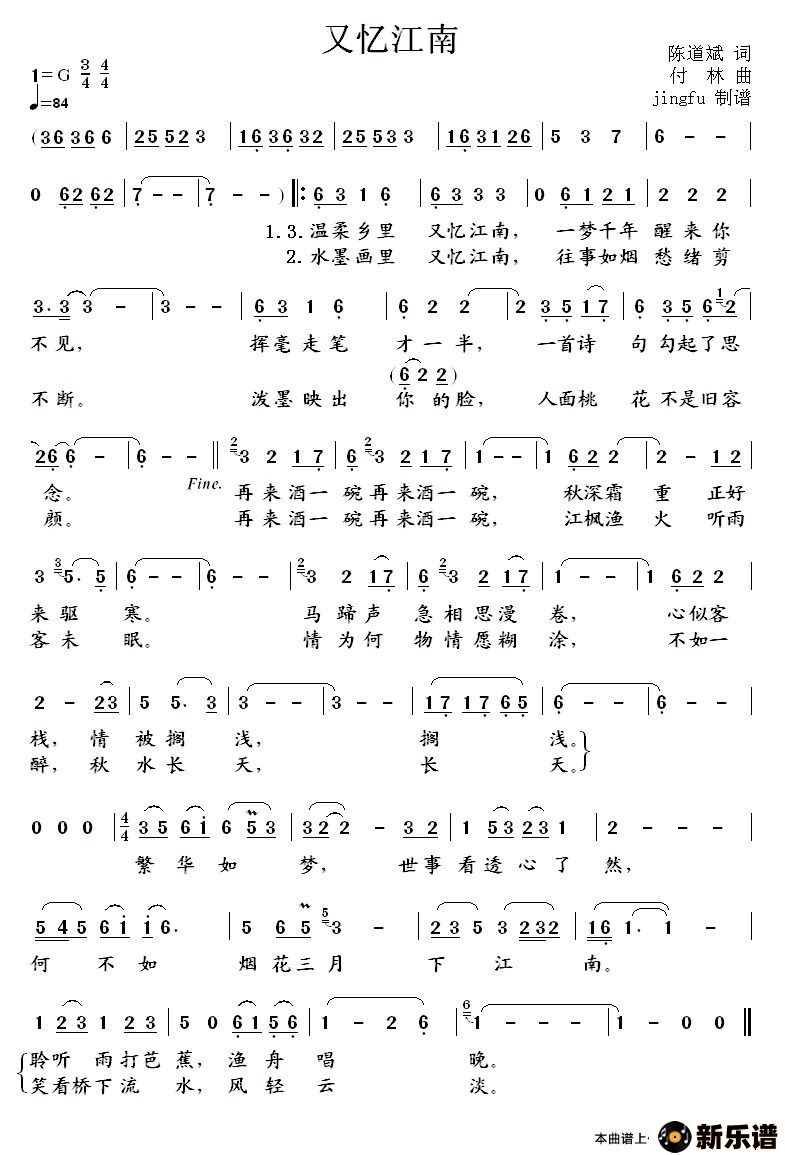 王欢演唱的又忆江南歌词,又忆江南最新曲谱.
