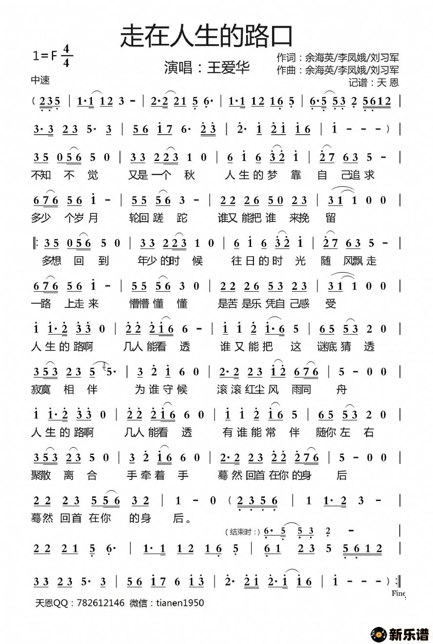 走在人生的路口 王爱华 王爱华演唱的走在人生的路口 歌词,走在人生的路口 最新曲谱. 不知不觉又是一个秋人生的梦靠自己追求多少个岁月轮回蹉跎谁又能把谁来挽留多想回到年少的时候往日的时光随风飘走一路上走来懵懵懂懂是苦是乐凭自己感受人生的路啊几人能看透谁又能把这谜底猜透寂寞相伴为谁守候滚滚红尘风雨同舟人生的路啊几人能看透有谁能常伴随你左右聚散离合手牵着手蓦然回首在你的身后蓦然回首在你的身后多想回到年少的时候往日的时光随风飘走一路上走来懵懵懂懂是苦是乐凭自己感受人生的路啊几人能看透谁又能把这谜底猜透寂寞相伴为谁守候滚滚红尘风雨同舟人生的路啊几人能看透有谁能常伴随你左右聚散离合手牵着手蓦然回首在你的身后蓦然回首在你的身后 此最新曲谱由新乐谱会员 天恩 上传