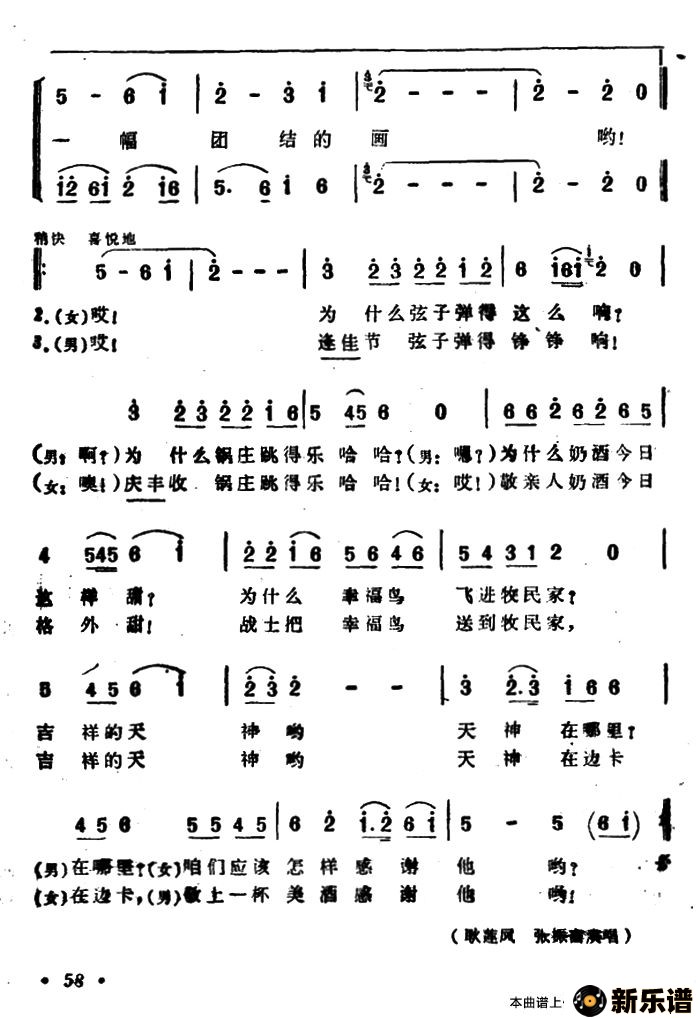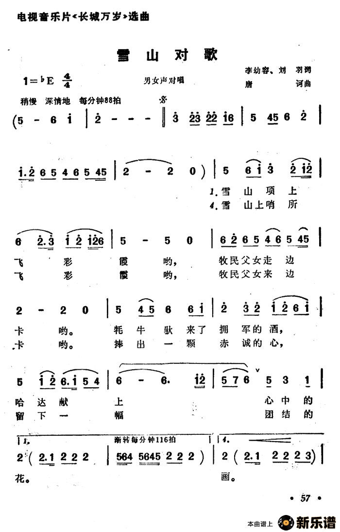 耿莲凤、张振富演唱的雪山对歌(电视音乐片《长城万岁》选曲)歌词,雪山对歌(电视音乐片《长城万岁》选曲)最新曲谱.
