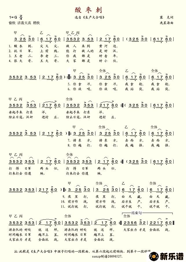 《酸枣刺》最新曲谱 中央人民广播电台少年广播合唱团