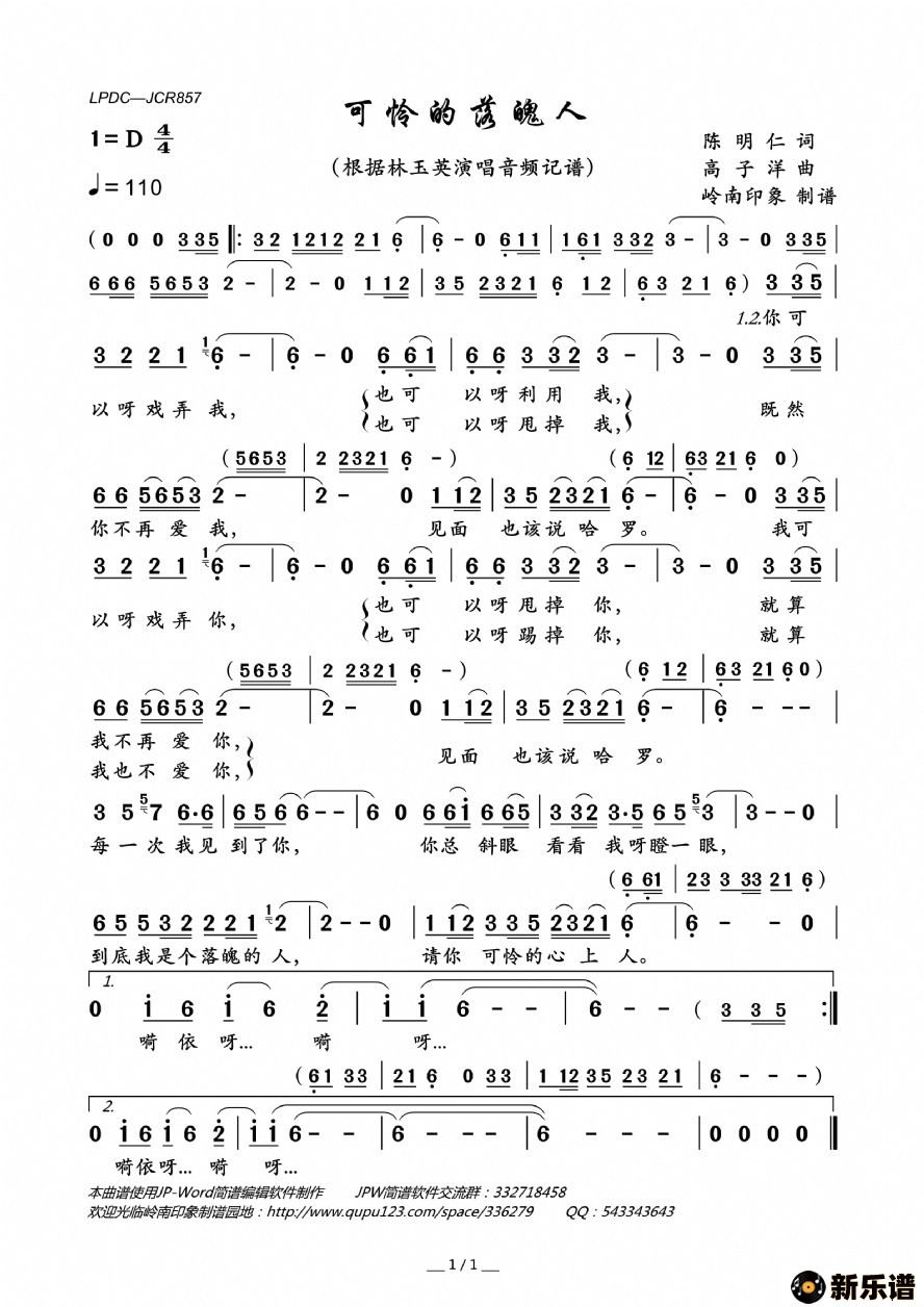 《可怜的落魄人》最新曲谱 林玉英-岭南印象制谱