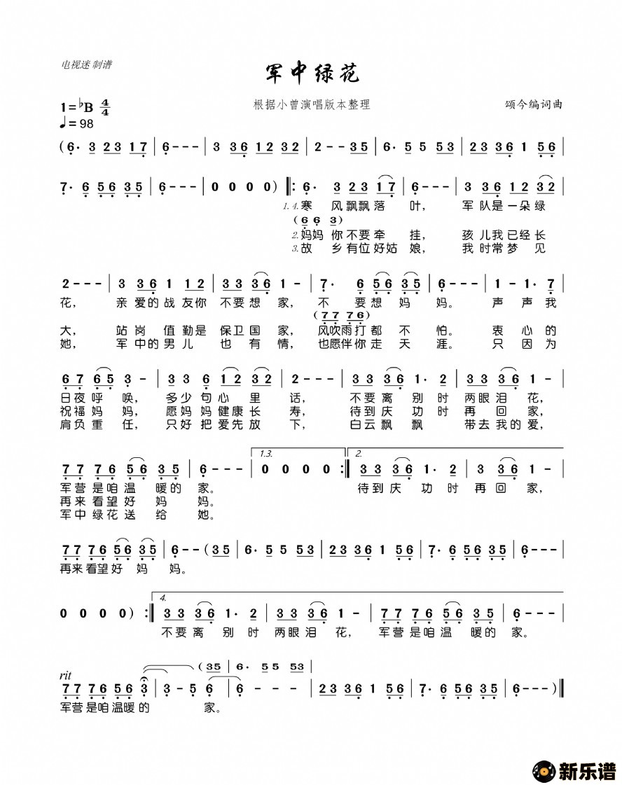 演唱的军中绿花歌词,军中绿花最新曲谱.