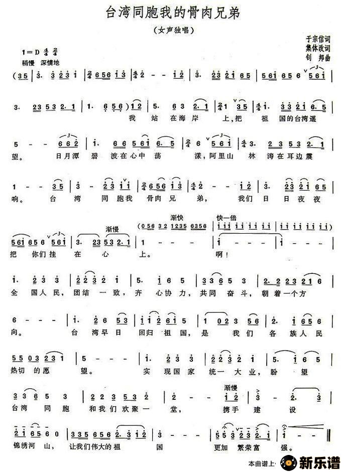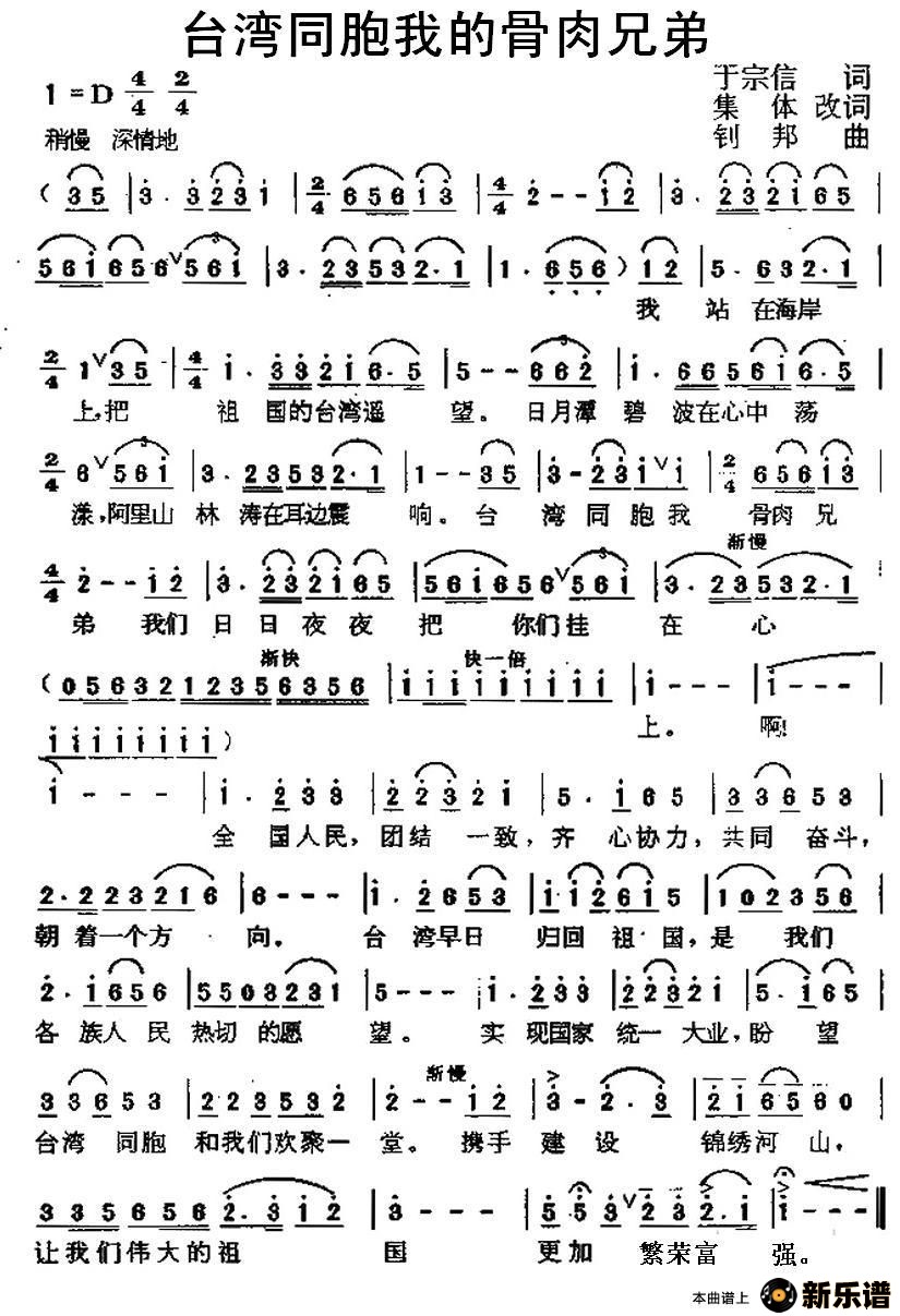 演唱的台湾同胞我的骨肉兄弟歌词,台湾同胞我的骨肉兄弟最新曲谱.