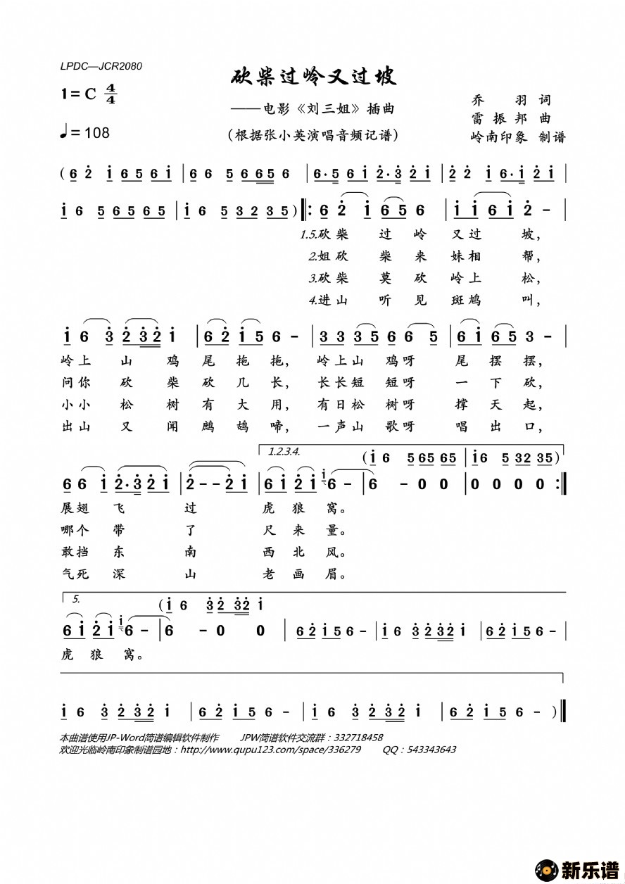 《砍柴过岭又过坡(电影《刘三姐》插曲)》最新曲谱 张小英-岭南印象制谱