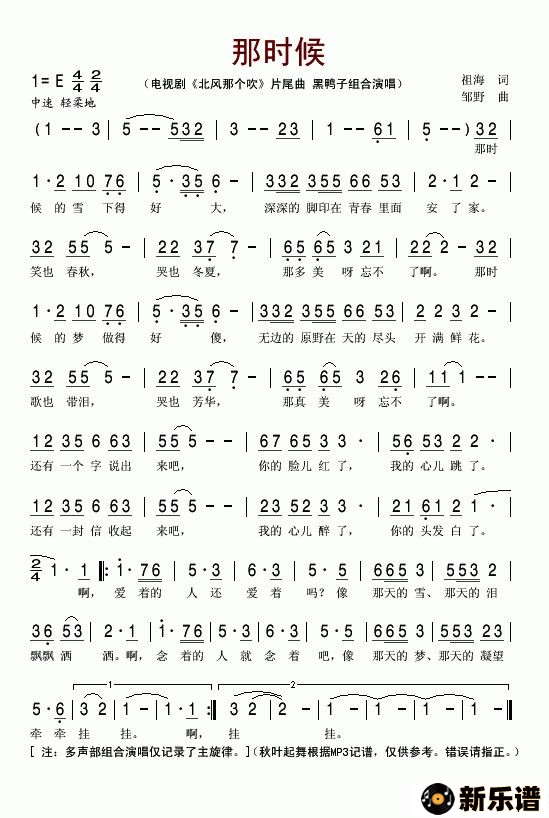 黑鸭子组合演唱的那时候(电视剧《北风那个吹》片尾曲)歌词,那时候(电视剧《北风那个吹》片尾曲)最新曲谱.