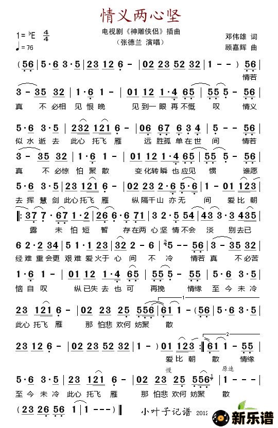 张德兰演唱的情义两心坚(电视剧《神雕侠侣》插曲)歌词,情义两心坚(电视剧《神雕侠侣》插曲)最新曲谱.