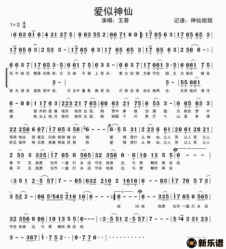 王蓉演唱的爱似神仙歌词,爱似神仙最新曲谱.