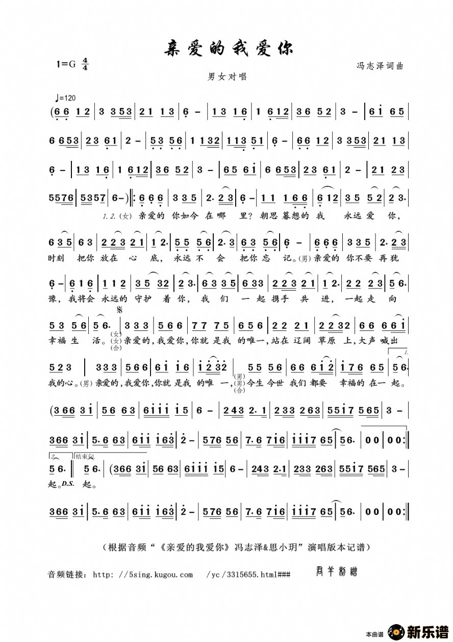 《亲爱的我爱你》最新曲谱 冯志泽、思小玥-君羊制谱