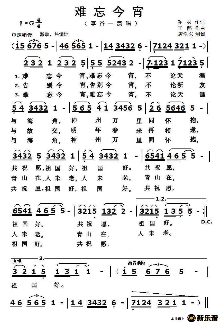 《难忘今宵》最新曲谱 李谷一