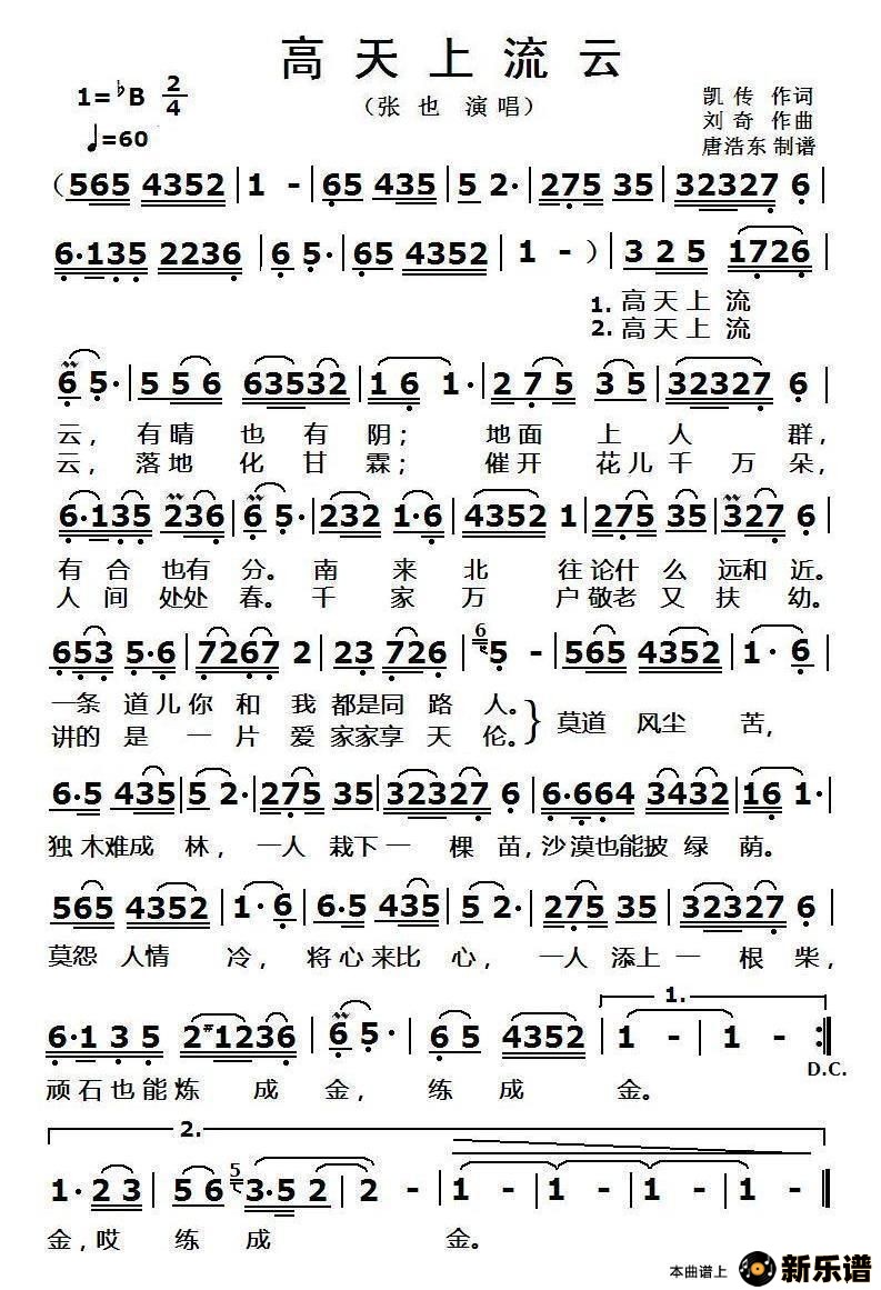 张也演唱的高天上流云歌词,高天上流云最新曲谱.