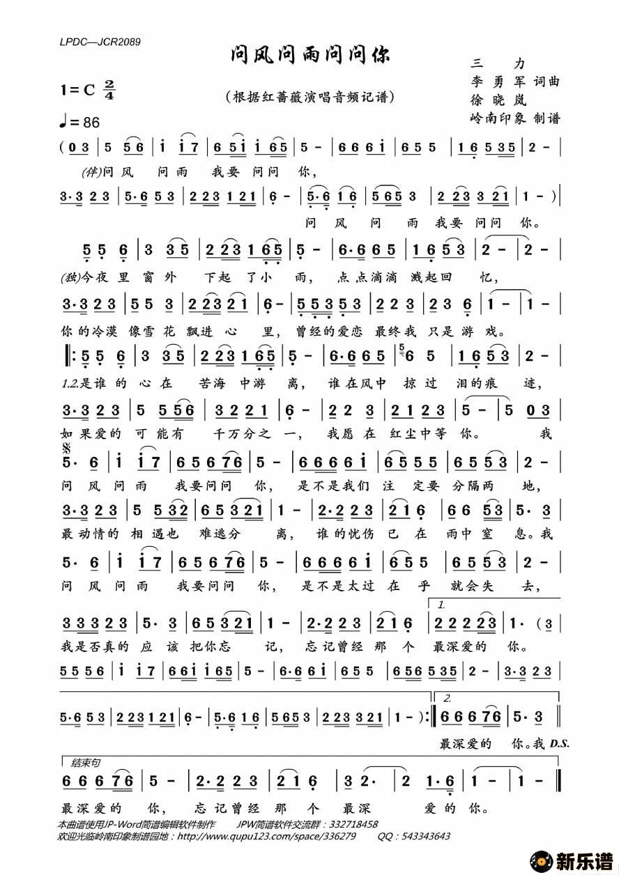 《问风问雨问问你》最新曲谱 红蔷薇-岭南印象制谱