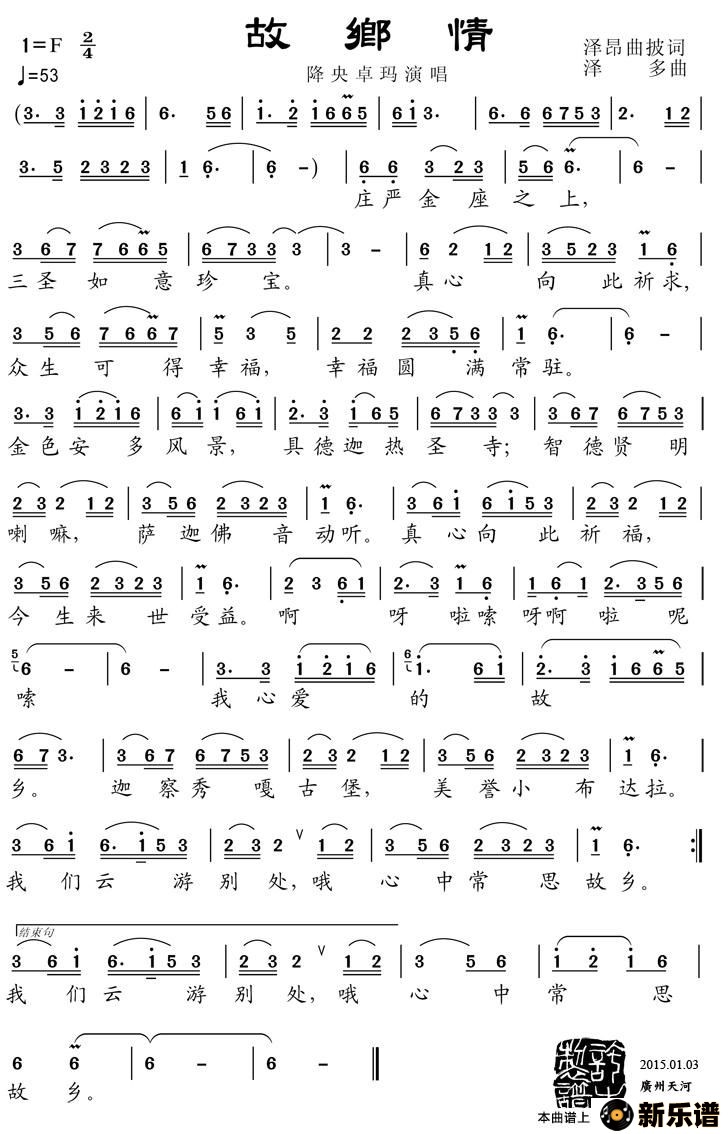 降央卓玛演唱的故乡情歌词,故乡情最新曲谱.