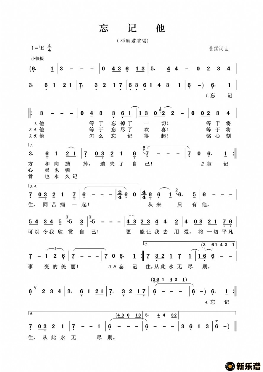 邓丽君演唱的忘记他歌词,忘记他最新曲谱.