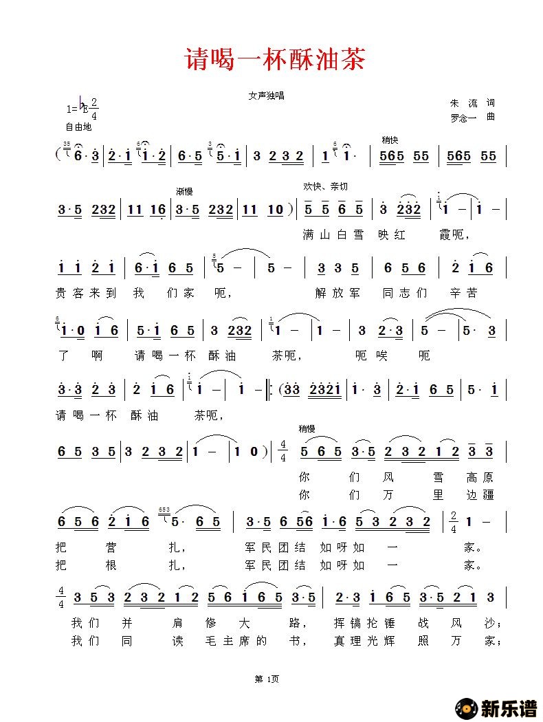 王珍演唱的请喝一杯酥油茶歌词,请喝一杯酥油茶最新曲谱.