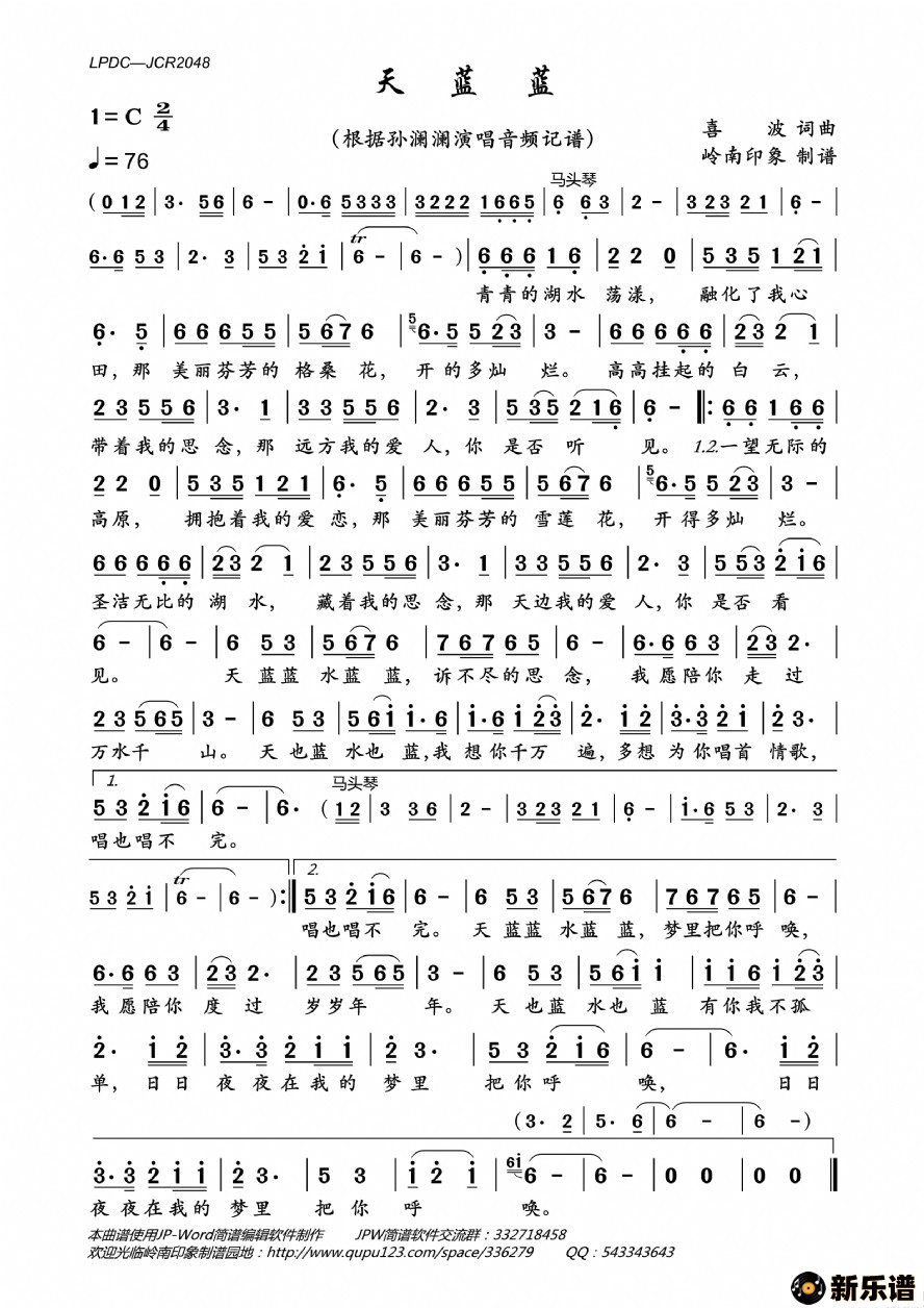《天蓝蓝》最新曲谱 孙澜澜-岭南印象制谱