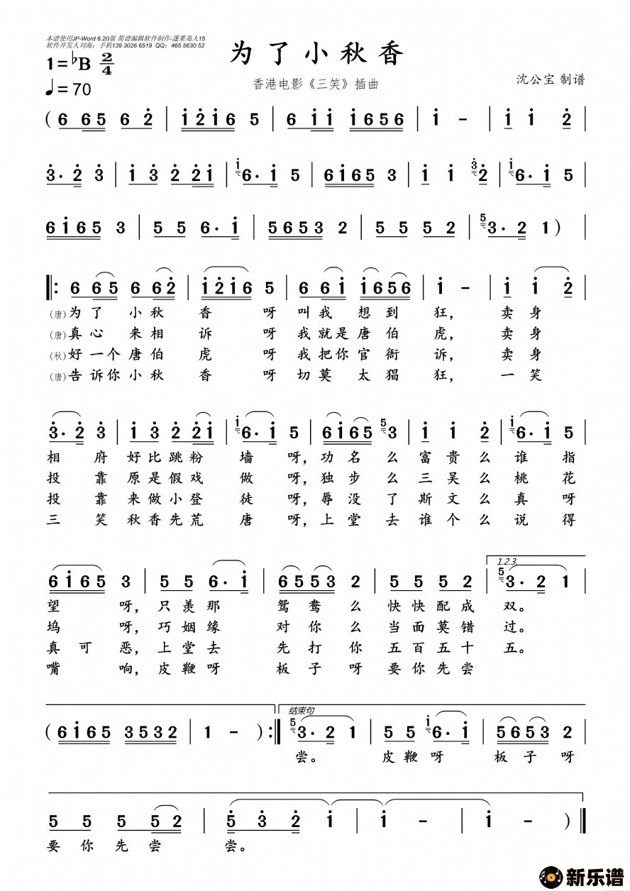 《为了小秋香》最新曲谱 -沈公宝制谱