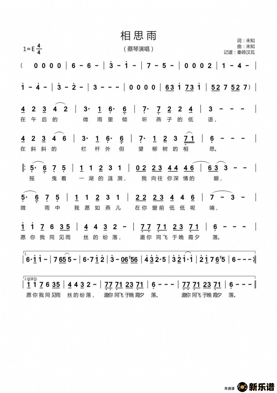 蔡琴演唱的相思雨歌词,相思雨最新曲谱.
