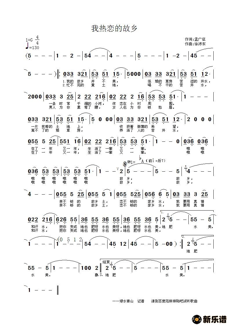 范琳琳演唱的我热恋的故乡歌词,我热恋的故乡最新曲谱.