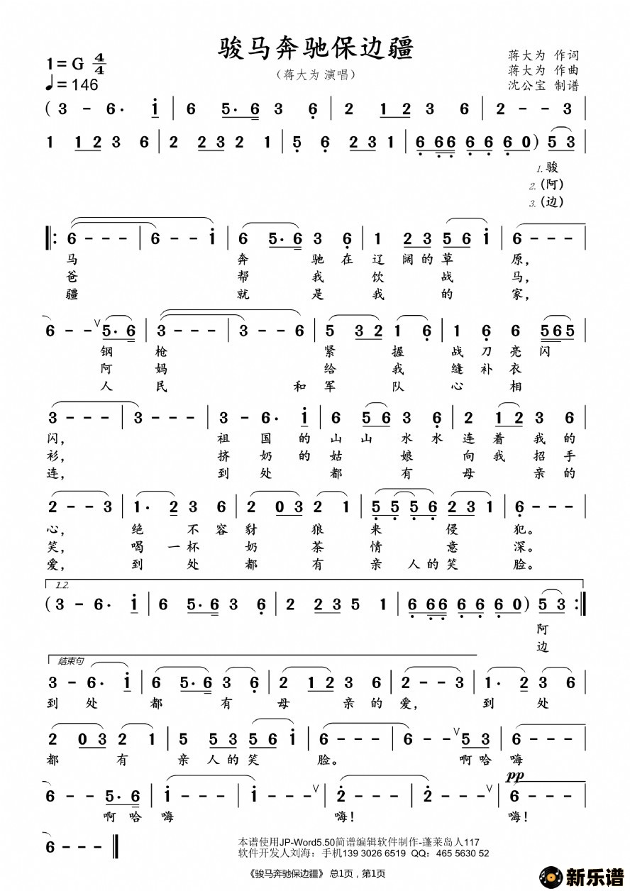 《骏马奔驰保边疆》最新曲谱 蒋大为-沈公宝制谱