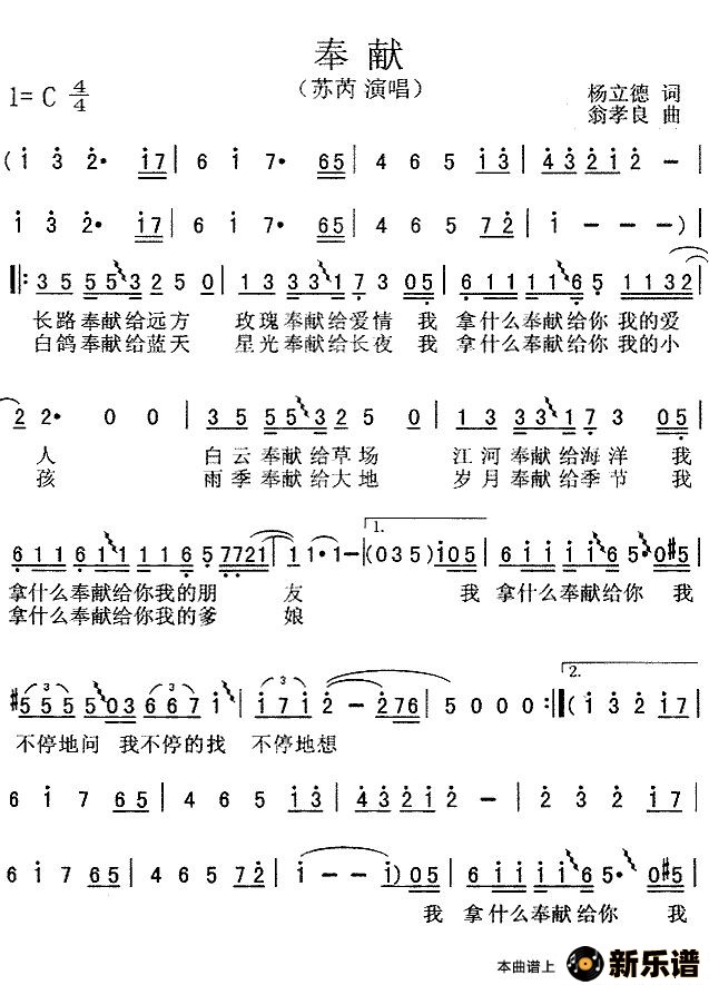 苏芮演唱的奉献歌词,奉献最新曲谱.