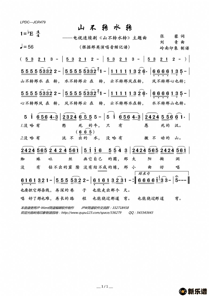 山不转水转(电视连续剧《山不转水转》主题曲)那英 那英演唱的山不转水转(电视连续剧《山不转水转》主题曲)歌词,山不转水转(电视连续剧《山不转水转》主题曲)最新曲谱. 此最新曲谱由新乐谱会员 岭南印象 上传