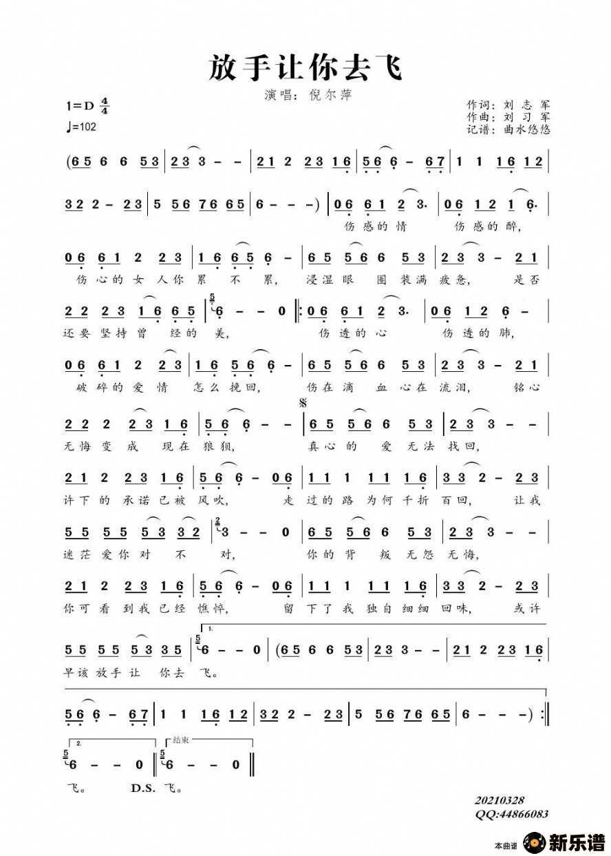 《放手让你去飞》最新曲谱 倪尔萍-曲水悠悠制谱