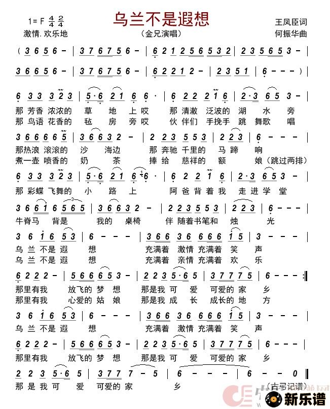 金兄演唱的乌兰不是遐想 歌词,乌兰不是遐想 最新曲谱.