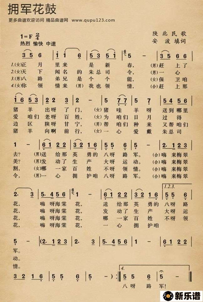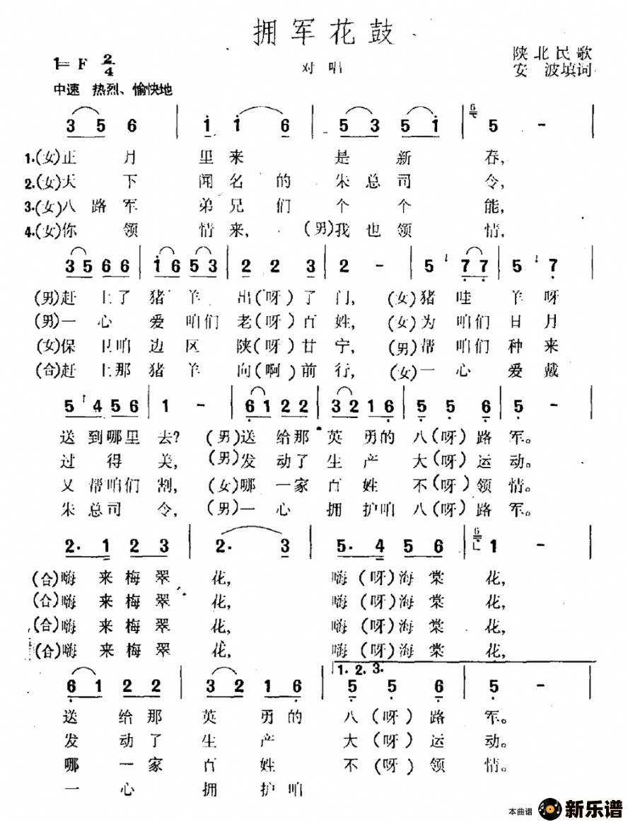 演唱的拥军花鼓歌词,拥军花鼓最新曲谱.