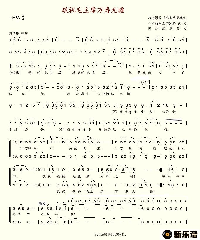 演唱的敬祝毛主席万寿无疆歌词,敬祝毛主席万寿无疆最新曲谱.