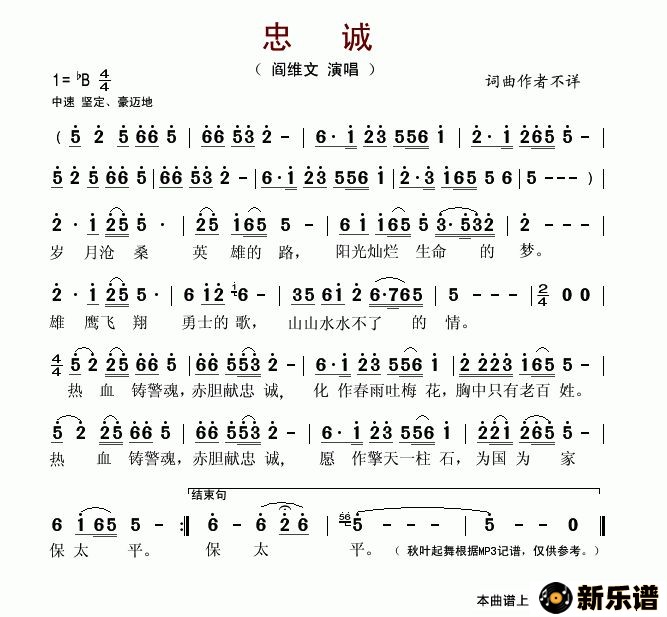 阎维文演唱的忠诚歌词,忠诚最新曲谱.
