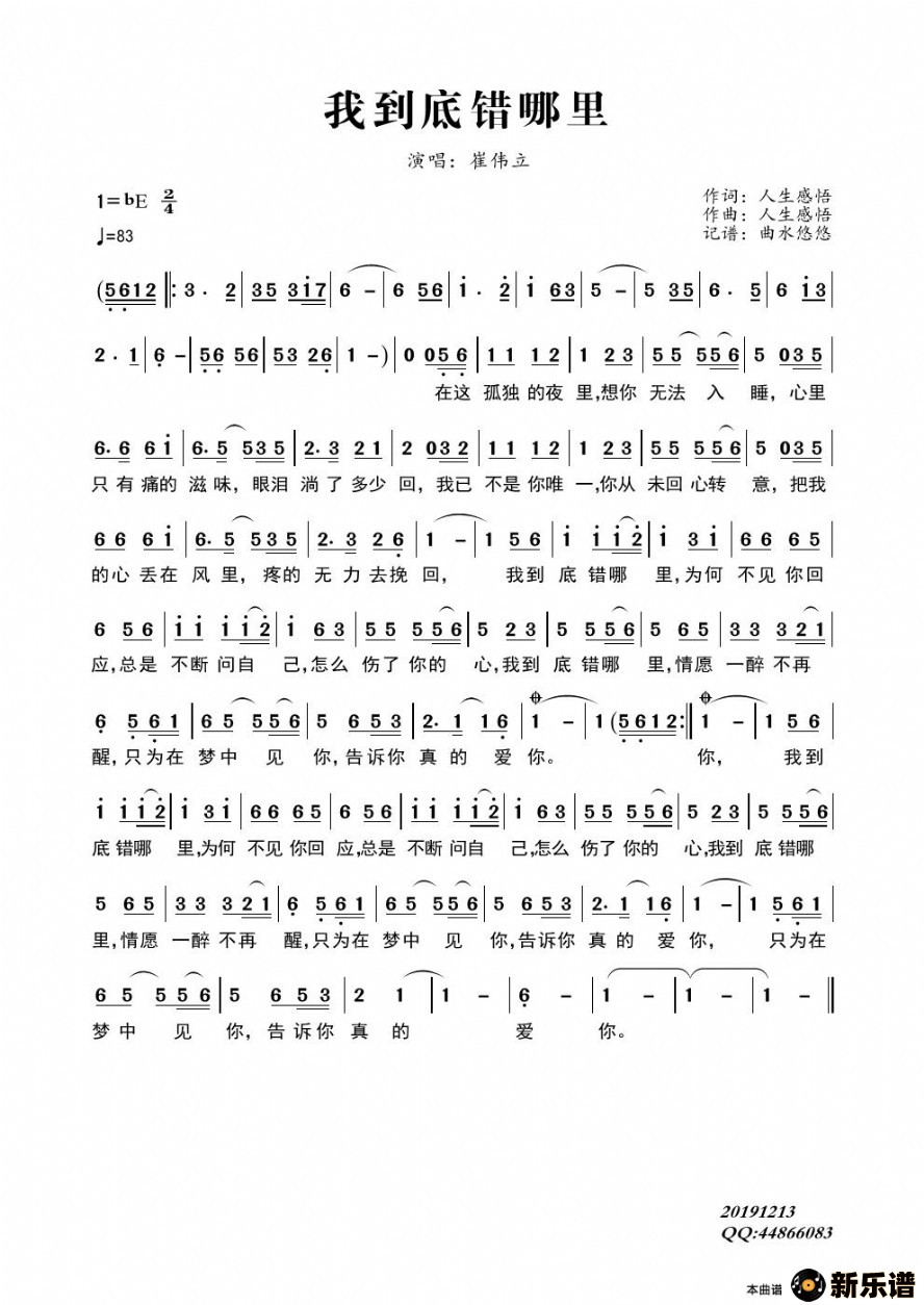 《我到底错哪里》最新曲谱 崔伟立-曲水悠悠制谱