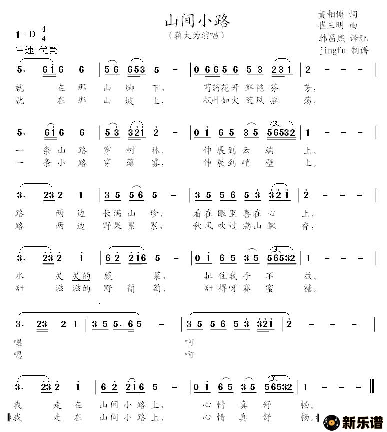 蒋大为演唱的山间小路歌词,山间小路最新曲谱.
