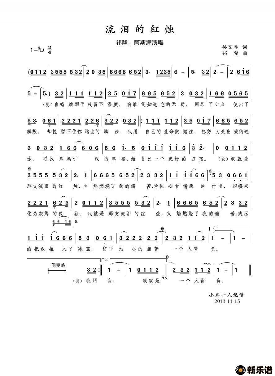 《流泪的红烛》最新曲谱 祁隆/阿斯满