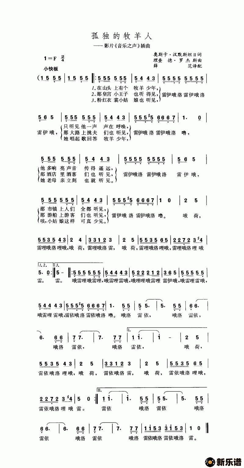【美】孤独的牧羊人(电影《音乐之声》插曲)(6个版本) 演唱的【美】孤独的牧羊人(电影《音乐之声》插曲)(6个版本)歌词,【美】孤独的牧羊人(电影《音乐之声》插曲)(6个版本)最新曲谱. 版本一:谱友俄罗斯旋律 扫描上传 版本二:谱友清风拂面转载上传 版本三:少儿考级曲目版本四版本五版本六