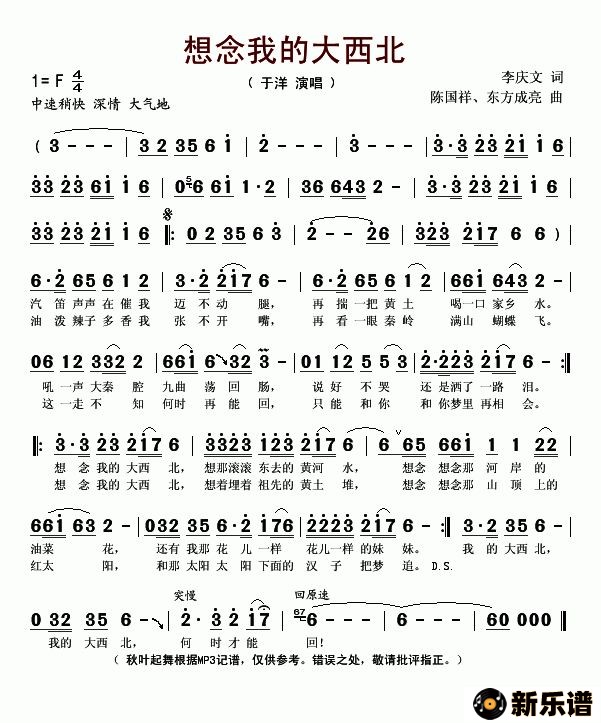 于洋演唱的想念我的大西北歌词,想念我的大西北最新曲谱.