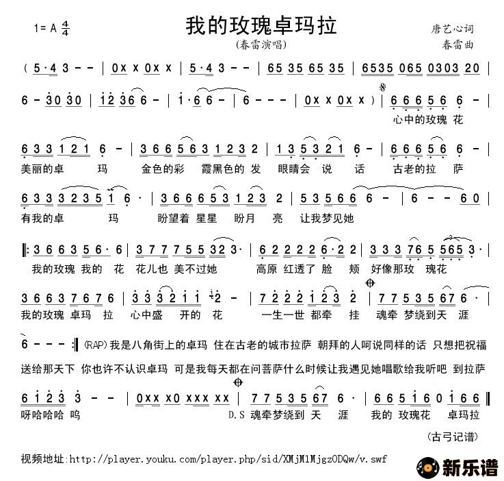 《我的玫瑰卓玛拉》最新曲谱 春雷-古弓制谱