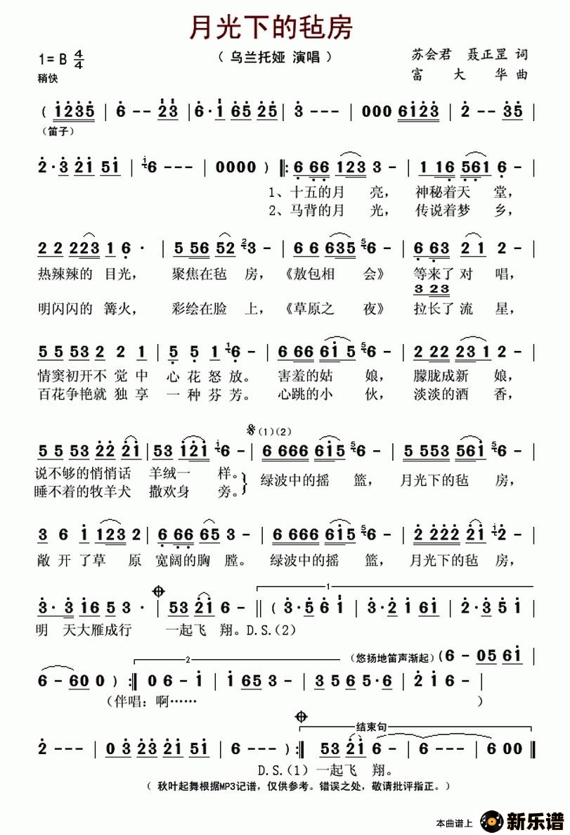 乌兰托娅演唱的月光下的毡房歌词,月光下的毡房最新曲谱.
