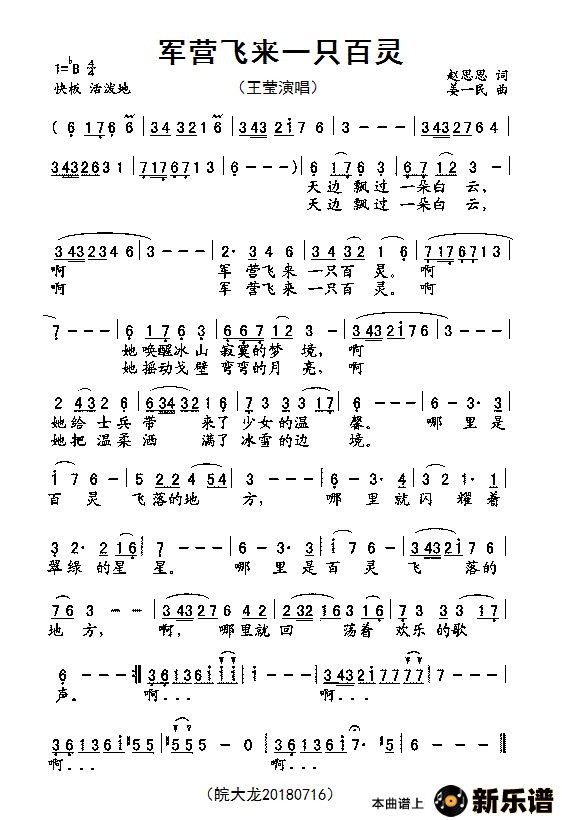 《军营飞来一只百灵》最新曲谱 王莹