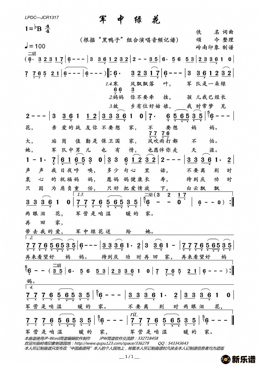 《军中绿花》最新曲谱 “黑鸭子”组合-岭南印象制谱
