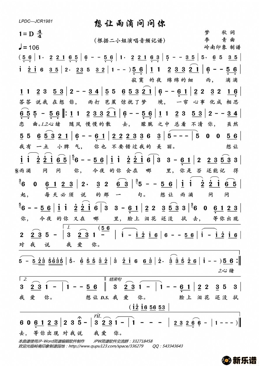 《想让雨滴问问你》最新曲谱 二小姐-岭南印象制谱